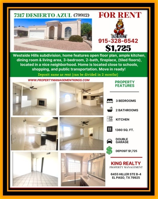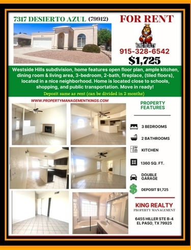 King Realty Property Management main goal is to protect and enhance the value of your property. Our diligent, trustworthy staff is here to ensure your satisfaction. We know all the aspects of real estate in the El Paso, and surrounding areas and assure you a maximum return on your investment. Our rates are affordable, we offer convenient and flexible hours, and there is